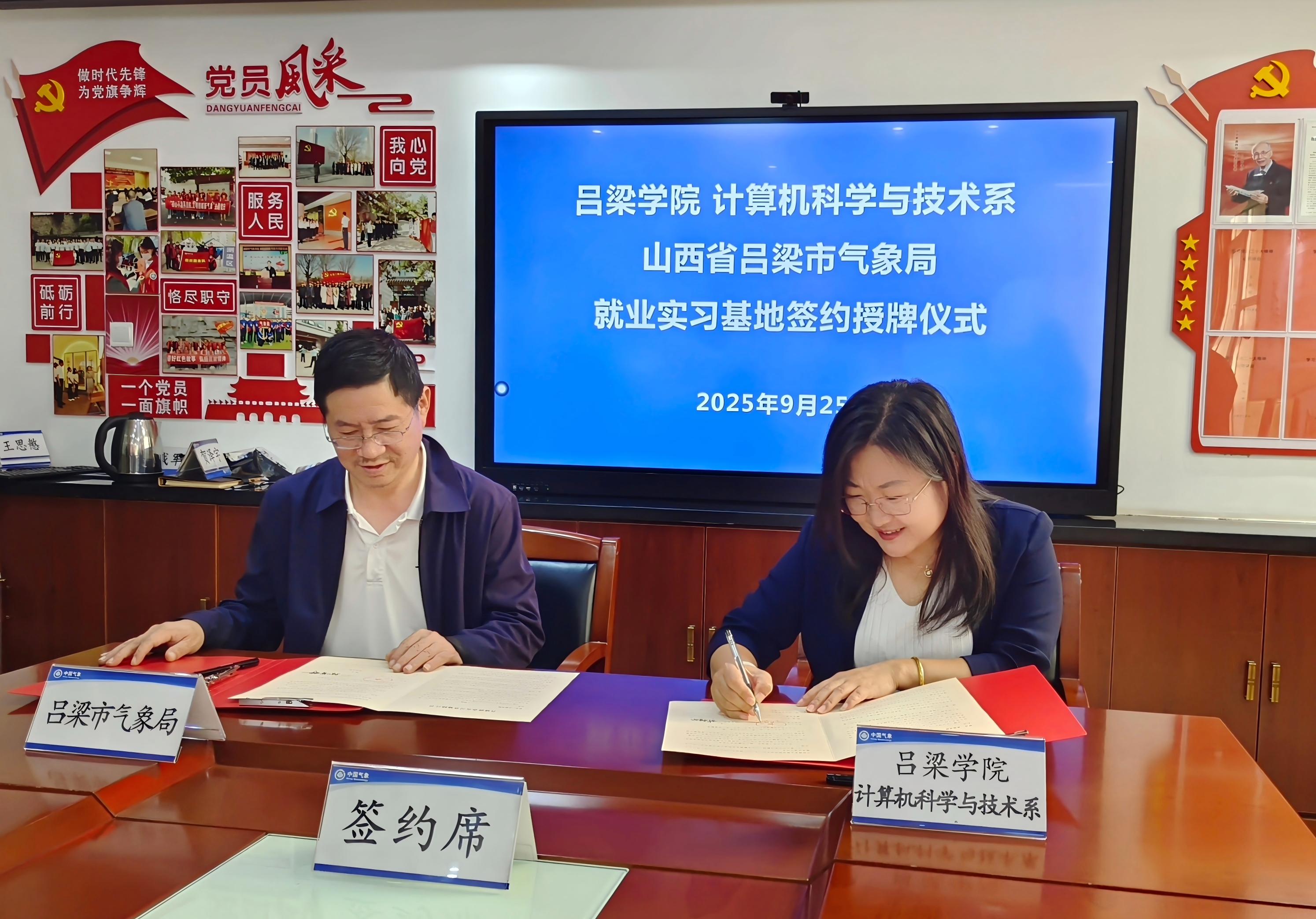为深入贯彻落实教育部关于加强校地协同育人相关要求,进一步拓宽学生就业实践渠道。2025年9月25日,计算机科学与技术系与吕梁市气象局举行校地实习实训基地签约及授牌仪式。计算机科学与技术系党总支书记李志荣、系副主任武桂芬,吕梁市气象局局长卫徐刚等相关人员出席签约仪式。